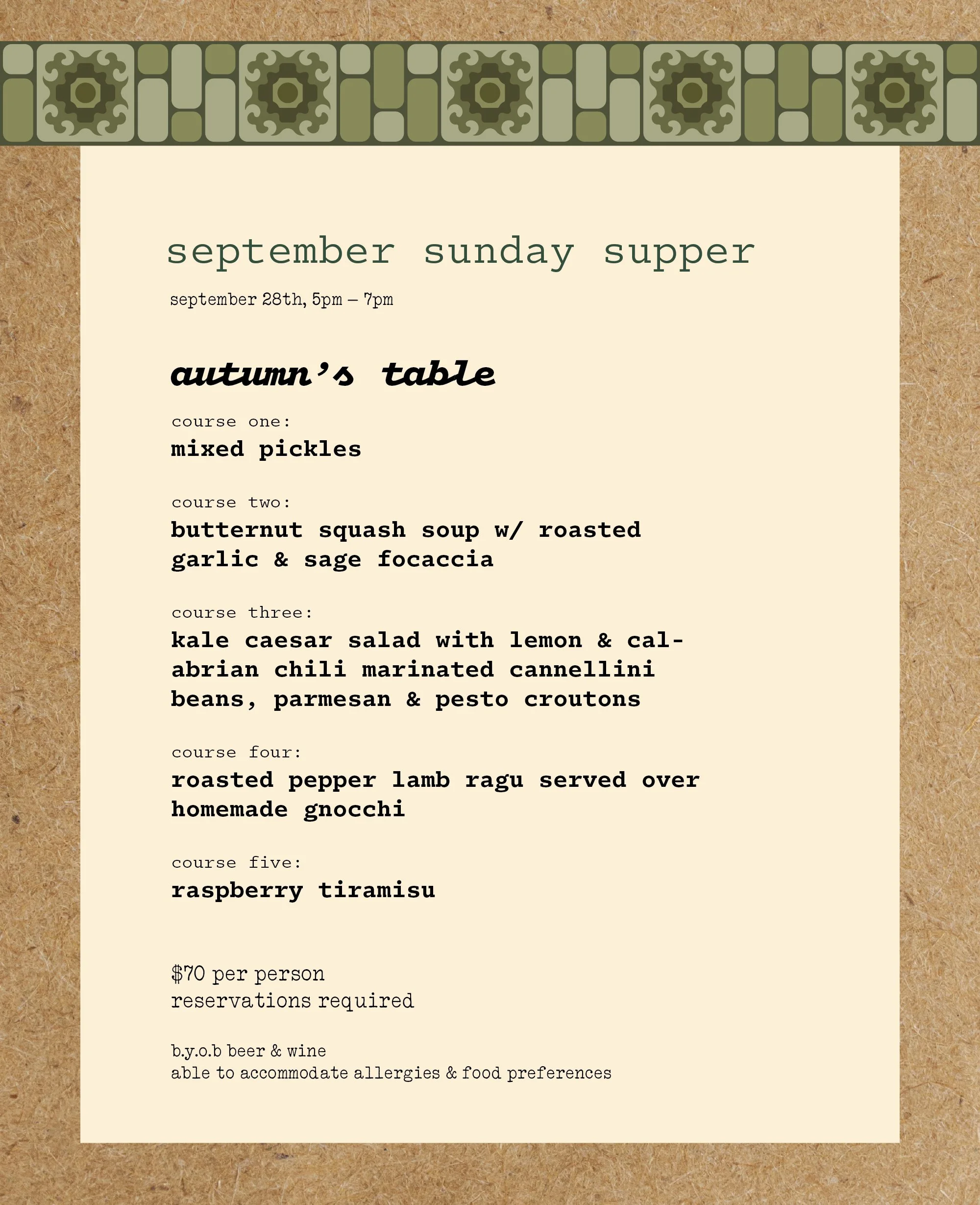 our next sunday supper will be held on september 28th with reservations opening september 1st.